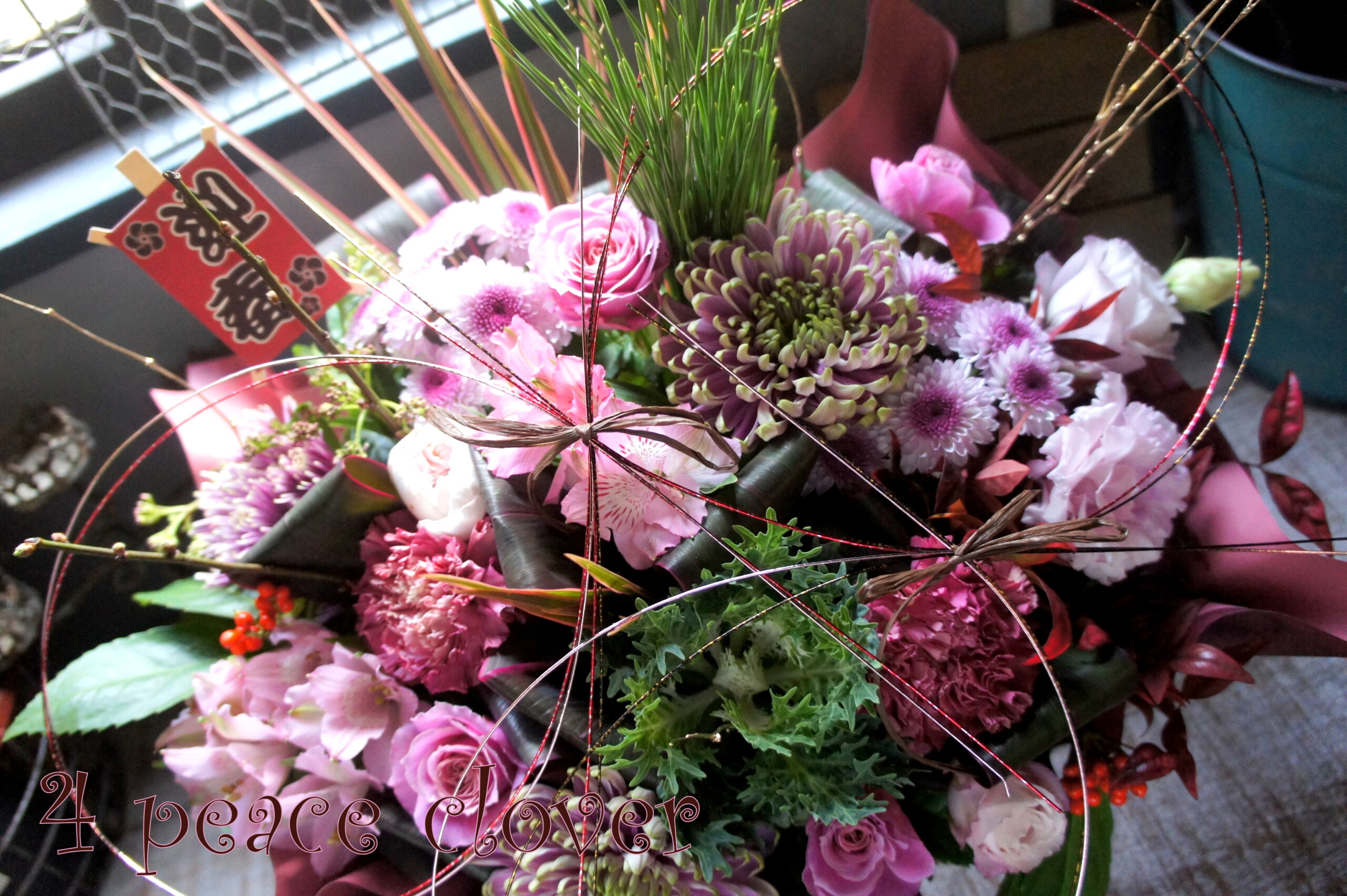 縁起物で、福を呼ぶ!和テイストのフラワーアレンジメント!!水引がイメージを華やかにしています